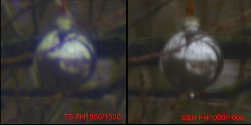 Hier mal ein Beispiel, beide Objektive gleich groß und gleiche Brennweite. Christbaukugel in 100m Entfernung, Ausschnittvergrößerung, regnerischer Tag ohne viel Kontraste.